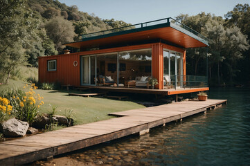 A vibrant container garden with a colorful assortment of blooming flowers in terracotta pots and wooden planters on a sunny patio