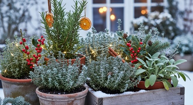 Balcony garden with terracotta pots and vibrant herbs bathed in golden sunlight
