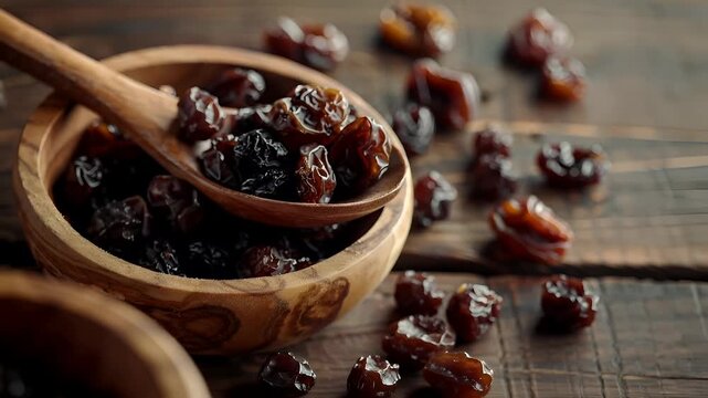 A closeup shot of a wooden bowl containing a wooden spoon filled with dried prunes. The bowl is placed on a wooden surface, and the background is blurred, emphasizing the bowl and its contents.