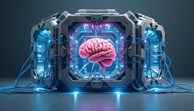 Human brain in futuristic containment unit with blue cables, conceptual AI brain computer interface and advanced artificial intelligence processing core