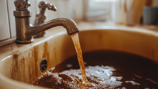 Rusty water flows from old faucet into a stained sink. Illustrates contaminated water supply, poor plumbing, or need for water filter.