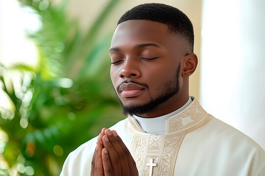 Young man in white clergy attire prays silently indoors at a serene location with greenery in the background, praying scene, meditation scene, copy space for text
