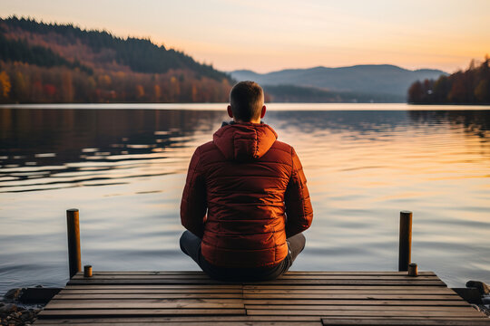 A young Black man watches the beautiful sunrise over the mountains in a peaceful and contemplative mood