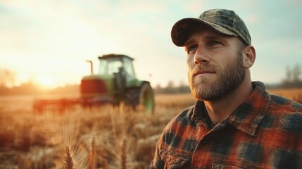 A contemplative farmer stands in a wheat field during sunset, with a tractor in the background, symbolizing hard work and connection to nature and rural life.