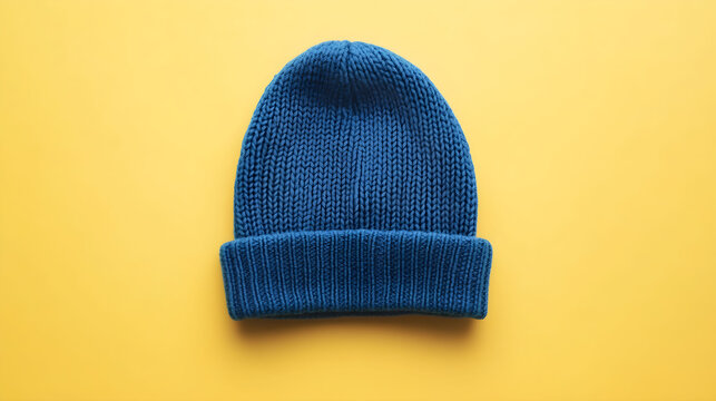 Blue knit beanie for mock up resting on a bright yellow background showcasing texture and color contrast in a minimalist setup