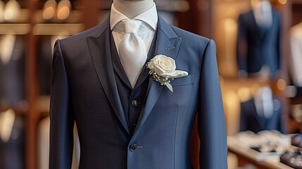 complete groom men's wedding suit with a white flower bud. in a modern sales hall or outfit rental salon
