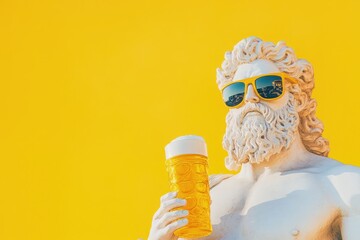 Greek God Zeus Statue Wearing Sunglasses Holding Beer Glass on Bright Yellow Background