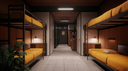 Cozy bunk bed accommodation modern hostel interior design minimalist environment wide angle view comfort and community
