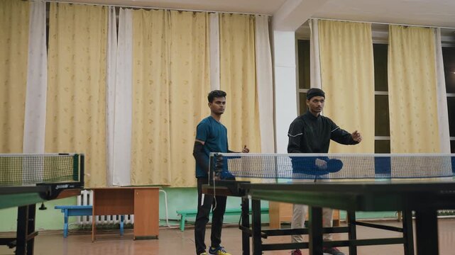 Two young contenders stand focused at indoor table tennis table, both preparing with paddles in hand and concentrated expressions, ready for match rally in brightly lit hall