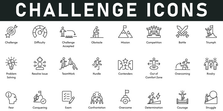 Challenge Icons vector illustration with thin line editable stroke contains difficulty, obstacles, mission, competition, battle, triumph, problem solving, teamwork, hurdles, rivalry, struggle, courage