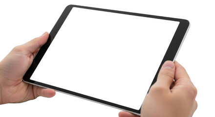 Hands holding a blank screen tablet device ready for content display or interaction