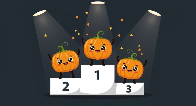 Three Cute Pumpkins on Winners Podium halloween autumn fall cartoon character celebration award prize happy smiling vegetable orange