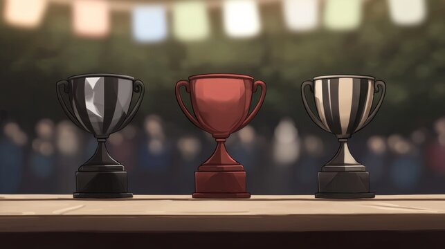 Giant trophy on an esports stage with large screens, neon lights, and smoke, symbolizing victory in a video game competition or e-sport championship.