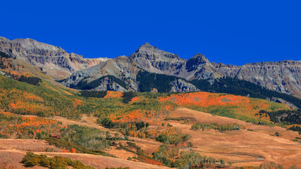 Colorful fall foliage on slopes of San Juan mountains in rural Colorado.