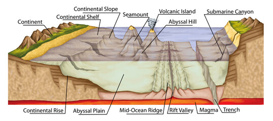 Didactic board of the ocean floor, sea floor, underwater relief, earth's oceans, bathymetry, geography, geology, continental shelf, slope and rise, abyssal plain and hill, magma, volcanic island