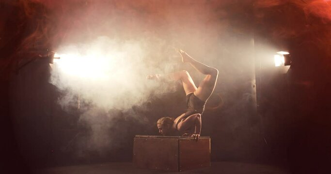 Close-up of a Flexible Woman Contortionist in Shiny Outfit Performing on Stage