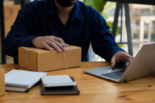 Portrait of a Small Business Startup, Owner, Asian Entrepreneur Working on boxes and laptops, checking online orders to prepare boxes. Selling to customers, SME business concept, online sales name