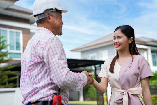 construction worker and contractor. Client shaking hands with team builder in renovation site.