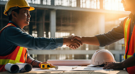 Construction workers in helmets shaking hands on building site, teamwork and agreement concept with sunlight, partnership and collaboration in modern industrial environment