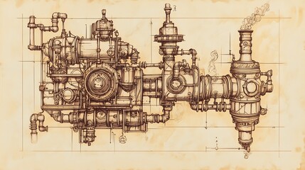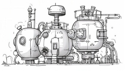 Whimsical steampunk factory with interconnected pods and pipes. Perfect for a game asset, children's book illustration, or concept art.