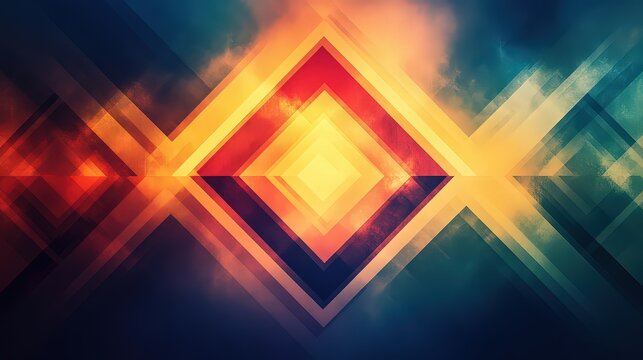 Sunrise over majestic mountains.  Dark, geometric peaks contrasted by a vibrant orange sun with golden rays.  Soft watercolor style