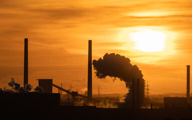 The image showcases tall industrial chimneys extending skyward into a dramatic and cloudy sky, capturing the essence of industrial growth and environmental impact.