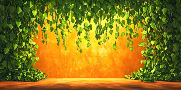 Creeper foliage on an orange concrete wall, enhanced by light and shadow contrasts during midday, Creeper foliage on an orange wall with light and shadow contrasts