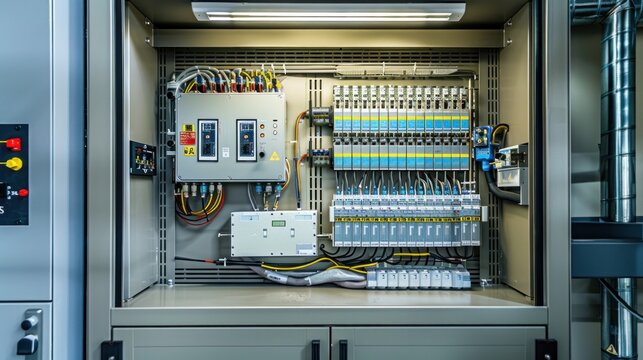 Electrical distribution cabinet with many automatic devices. Metal electrical cabinet close-up. Electrification control panel. Control panel for electrical equipment at the enterprise.