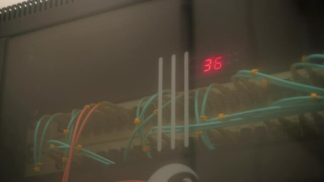 Control cabinet with breakers colorful buttons and display with digits in spacious plant workshop extreme close view