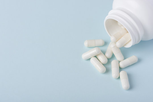 Pills with white powder in white plastic bottle on blue background with copy space
