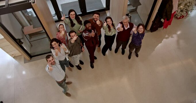 An overhead view captures a diverse group of employees gathering in a sleek corporate foyer, conveying a sense of collaboration and corporate culture, showcasing a diverse and inclusive workplace.