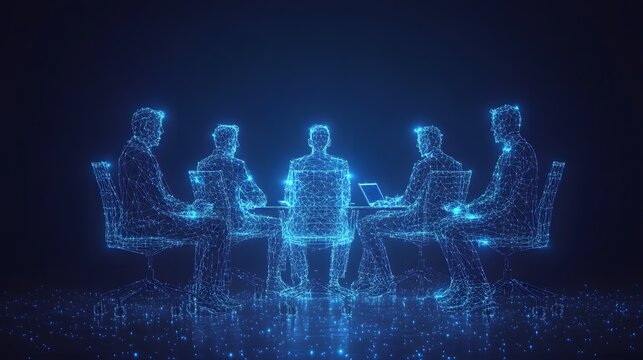 Digitally rendered wireframe silhouettes of business colleagues convene around a table. ..Created with Generative AI, not depicting real subjects.
