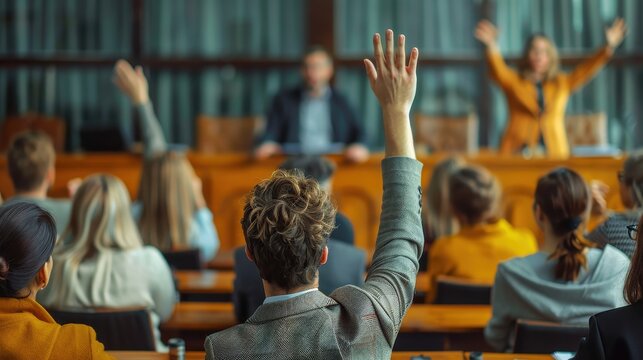 An organized meeting environment where individuals raise their hands to participate creates a collaborative and engaging atmosphere, reflecting active involvement and decision-making.