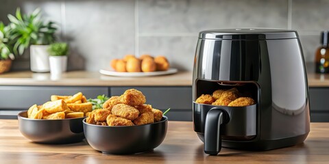 Sleek black air fryer cooking crispy chicken nuggets on kitchen counter, air fryer, black, sleek, cooking