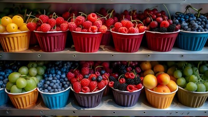 Colorful fruit cups with berries on shelves for fresh snack options . Concept Fruit Cups, Fresh Snacks, Colorful Options, Berries, Shelf Display