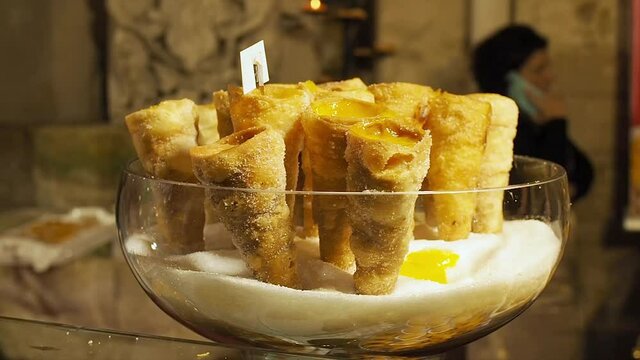 ALCOBACA, PORTUGAL - Nov 17, 2019: A traditional Portuguese conventual sweet called Cornucopias sold during the conventual show