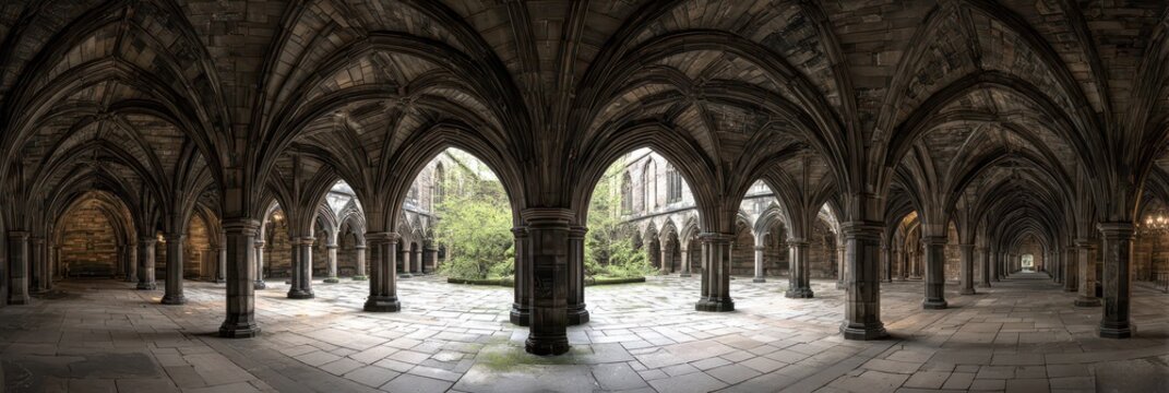 Panoramic View of Historic Cloisters at Glasgow University: A Gothic Architectural Marvel in Scotland