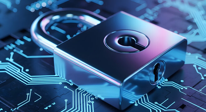 Close up of a metallic padlock on a blue glowing circuit board. Symbolizes the convergence of physical and digital security, encryption, and data protection technology.