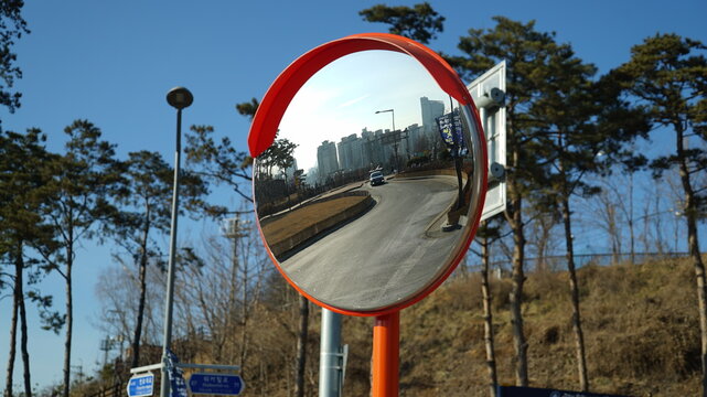 Corridor inside a building with blind corners and a convex saConvex safety mirror mounted on a wall opposite a blind corner of an interior corridorfety mirror