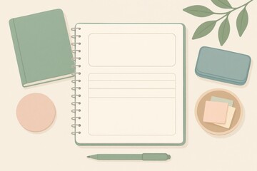 Minimalist workspace arrangement featuring a green notebook, spiral planner, pastel sticky notes, and a pen on a soft textured background conveying organization and creativity