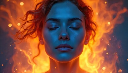 Abstract double exposure portrait of a woman with colorful, vibrant light effects conveying creativity, emotion, and introspection.