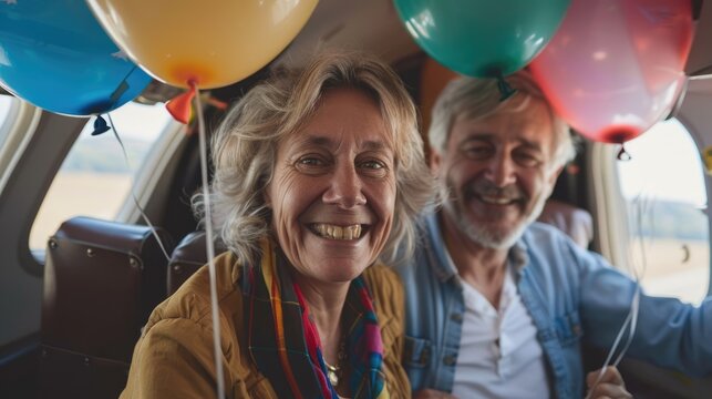 Close-up of a middle-aged woman and man holding balloons inside an airplane, their smiles radiant with happiness, captured from a dynamic angle to convey their excitement