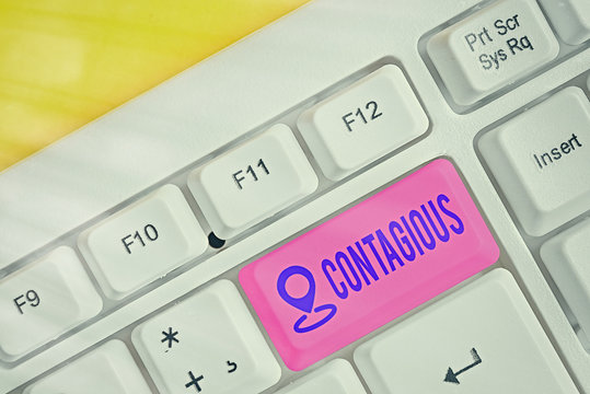 Handwriting text writing Contagious. Conceptual photo transmissible by direct or indirect contact with infected an individual White pc keyboard with empty note paper above white key copy space