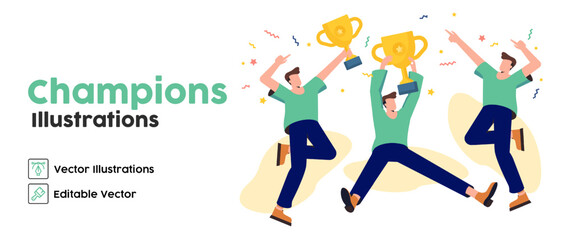 Champions Concept illustrations. Collection of scenes with people jump and bring trophy