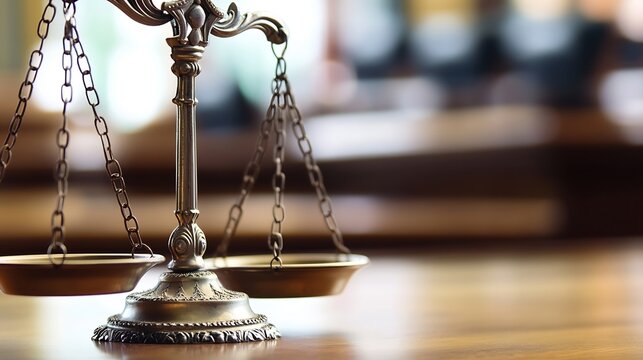 Elegant bronze scales of justice shining in a courtroom setting conveying law and order concepts : Generative AI