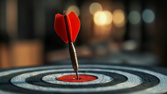 A dart hits the bullseye with precision, symbolizing success and achievement in a professional setting. The image conveys focus, goal-oriented mindset, and motivation
