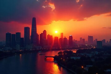 A sleek, modern cityscape skyline at sunset, signifying broad influence and high-status achievement The image conveys success, ambition, and widespread impact , sunset, impact, growth