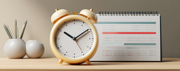Yellow alarm clock and desk calendar on wooden table conveying time management and productivity in warm minimalist workspace