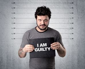 A depressed prisoner sits alone in a prison cell in a police station. The middle aged convict is tired and pensive.