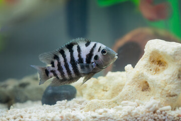 The convict cichlid fish Amatitlania nigrofasciata. Convict Cichlid fish swimming. Big beautiful nigrofasciata underwater close up. Cichlasoma nigrofasciatum, convict cichlid fish Amatitlania nigro.